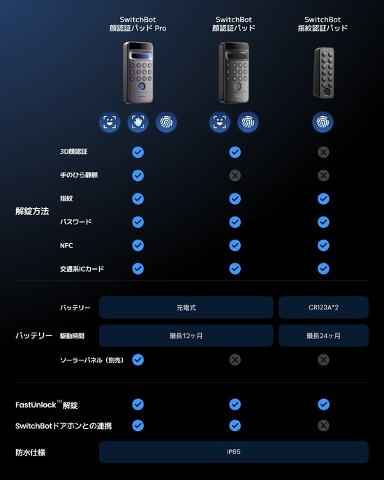 顔認証パッドPro/顔認証パッド/指紋認証パッド機能比較