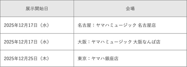 発売に先立ち、12月より下記のヤマハミュージック店舗にて先行展示いたします。ご試弾のご予約は、各店舗へお問い合わせください。