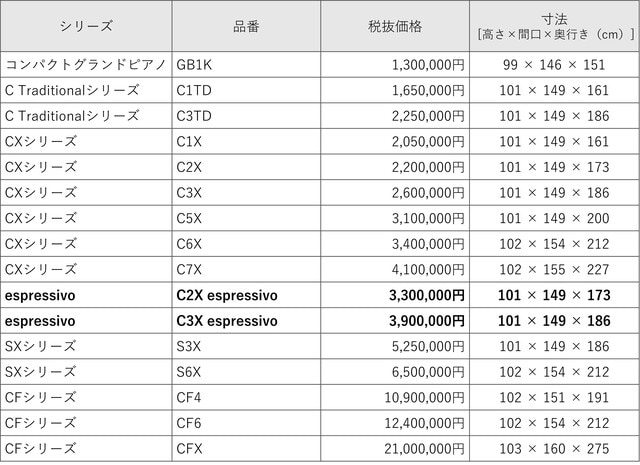 ヤマハ グランドピアノ ラインアップ一覧表※