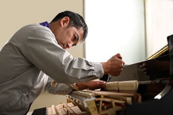 熟練の職人が多くの時間をかけて、ピアノ本体や細かな部品ひとつひとつの状態に応じて音作りやアクション機構の調整を精密に行うことで、一台一台のピアノの魅力を最大限に引き出します。低音から高音までバランス良く多彩に変化する音色や、繊細なタッチ感の細部まで手作業で整えます。