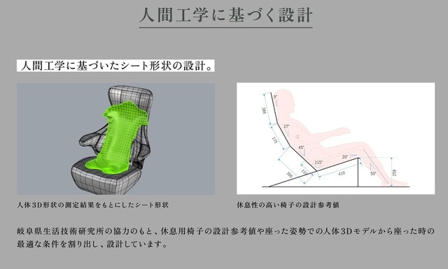 公的な研究所の協力のもと、人体3Dモデルから座った時の最適な条件を割り出し、設計しています。体への負担を軽減する体圧分散を実現しています。