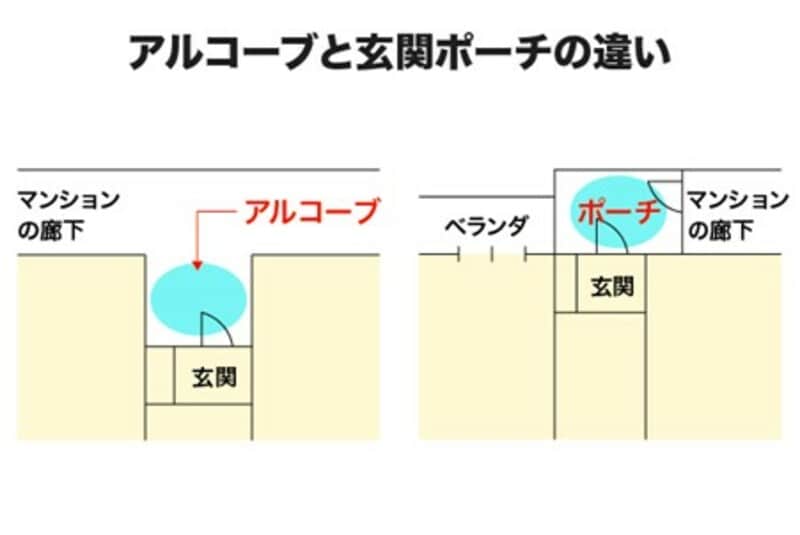 例外はあるものの、アルコーブは共用廊下の延長として門扉がなく、玄関ポーチには門扉が設置されることが多い点です。玄関ポーチはベビーカーや自転車などの私物を置けることが多い一方、アルコーブは住人全員の共有スペースとして、個人で自由に物を置いたり装飾したりすることができないケースも多いです。物件によって使用ルールは異なるため、正確に把握するには管理規約などで使用ルールの確認を行う必要があります。