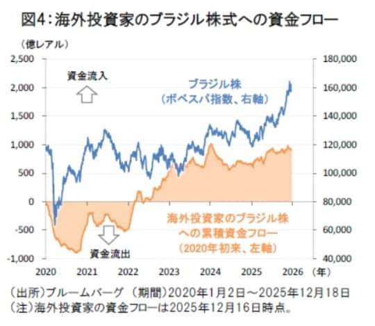 一方、2025年のブラジル株式市場では、主要株価指数のボベスパ指数が年末にかけて史上最高値を更新するなど、株価の好調が続いています。海外投資家のブラジル株への資金流入が回復基調にあることが、需給面から株高基調を支える要因になっていると言えます[図表4]。
