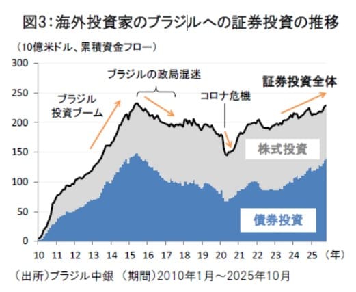 海外投資家の証券投資は2010年代前半のブラジル投資ブームの中で流入が加速したものの、2015年以降のブラジルの政局混迷や2020年のコロナ危機を受けて資金流出の傾向が続いてきました。しかし、コロナ危機以降は証券投資が流入傾向に転じ、足元では債券投資を中心にブラジルへの資金流入が拡大しつつあります[図表3]。
