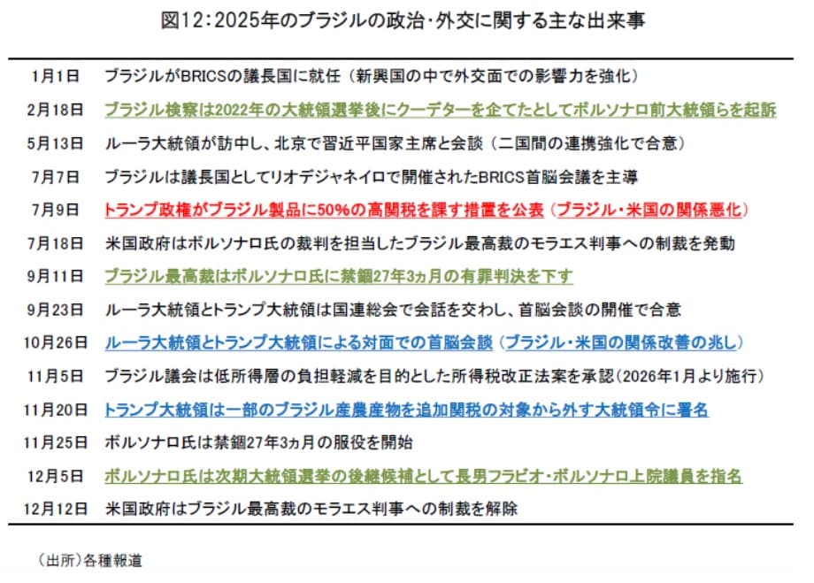 ブラジル国内ではクーデターを企てた罪からボルソナロ前大統領の起訴と裁判が進む中、ボルソナロ氏の盟友とされるトランプ大統領は2025年7月にブラジルに対して50%の大幅関税を課す措置を公表しました[図表12]。