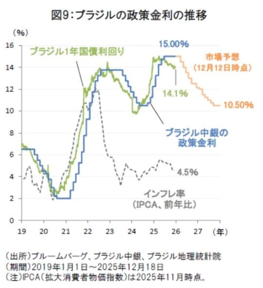 2026年にはインフレ圧力の後退に伴って、ブラジル中銀の利下げ余地が生まれるとみられます。市場予想では、2026年3月以降、中銀が利下げに転じるとの見方が大勢であり、政策金利は2027年末には10.50%まで引き下げられると見込まれています[図表9]。足元で14%近辺にあるブラジル国債利回りは、2026年には緩やかな低下(債券価格は上昇)に向かう可能性がありそうです。