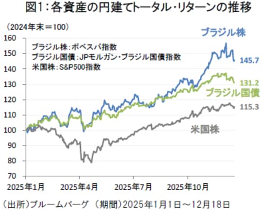2025年はブラジル資産の円建てパフォーマンスが大きく改善した年となりました。ブラジル株やブラジル国債の円建ての投資収益(トータル・リターン)は、年初来で米国株を上回る好調を維持しています[図表1]。