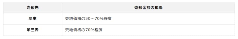 地主に売却する場合、売却金額の相場は更地価格の50~70%程度となります。地主には買い取り義務がないため、交渉次第では相場の下限に近い価格になることもあります。