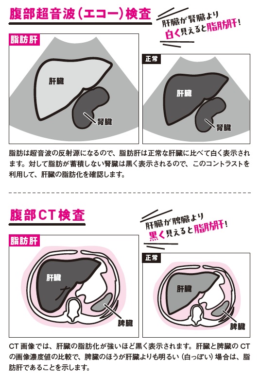 血液検査では肝機能障害の疑いを探るまでで、脂肪肝の有無は確認できません。脂肪化の程度や炎症の進行度には画像検査が不可欠です。