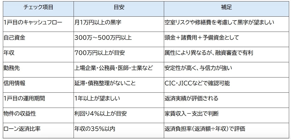 では、どのような状態なら2戸目に進めるのでしょうか。FPとして買い増しを判断する際は、「キャッシュフロー黒字 + 自己資金 + 与信力」の3点セットを重視します。