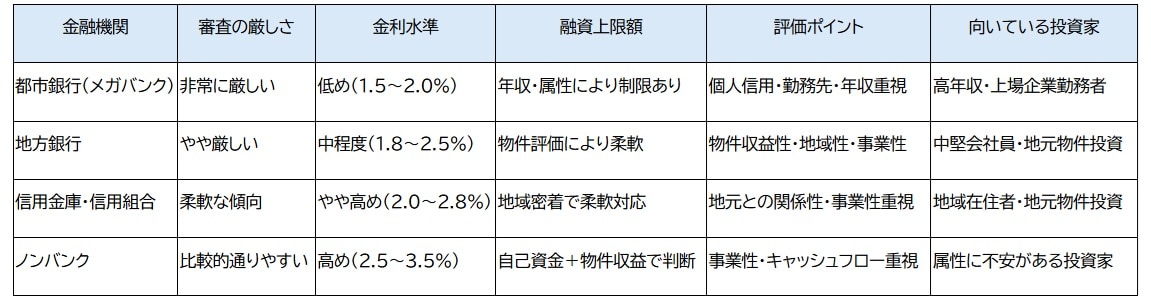 金融機関によって「なにを重視するか」は異なります。地方銀行や信用金庫は、物件の収益性や地域性を重視する傾向があり、1戸目と違う視点で評価してくれることも。ノンバンク系は、属性より事業性重視で通りやすい場合もあります。