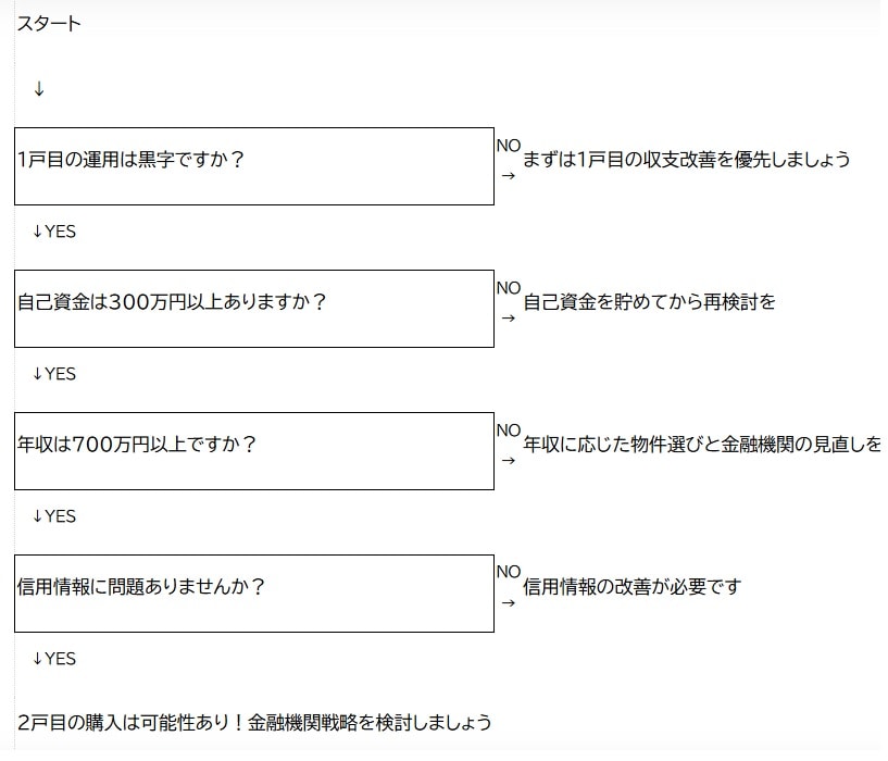 2戸目の買い増しにはタイミングも重要です。下記のチャートで、自分の状況をチェックし「2戸目を買ってもいいタイミングかどうか」を判断してみましょう。特に、1戸目の収支がマイナスの場合、2戸目で挽回しようとするのは危険です。まずは1戸目の経営改善を優先すべきです。