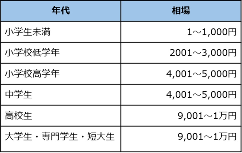 株式会社インテージが行った調査によると、お年玉の金額は子どもの年齢によって異なり、小学生未満では「1〜1,000円」、小学校低学年では「2,001〜3,000円」が最も多い結果となりました。年代別の相場は下記のとおりです。