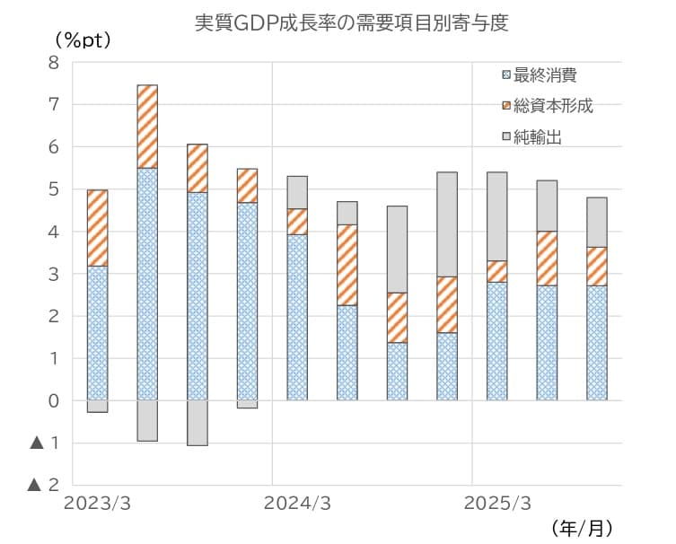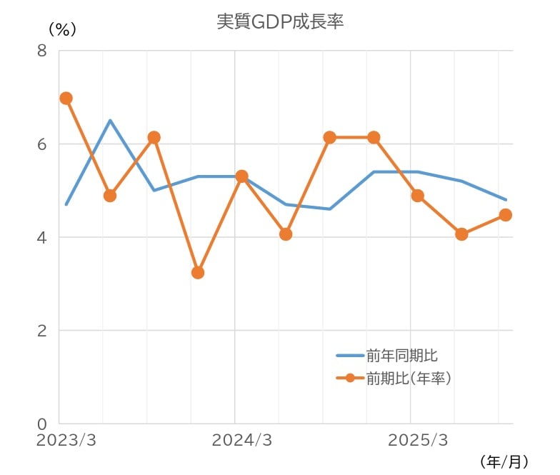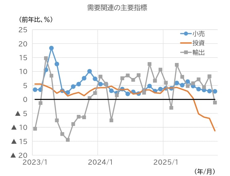 中国の2025年7~9月期の実質GDP成長率は、前年同期比+4.8%と、前期(25年4~6月期)の同+5.2%から減速した(図表1)。需要項目別にみると、総資本形成の寄与が低下した一方、純輸出や最終消費が堅調に推移し、総じて小幅な減速にとどまった(図表2)。単月の指標をみると、投資の悪化に歯止めがかかっておらず、小売も減速を続けている(図表3)。輸出も10月には悪化した。
