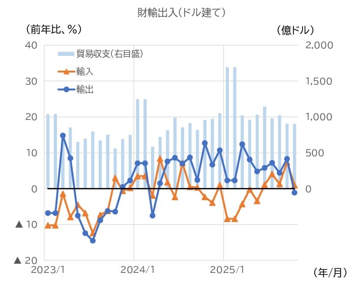ASEAN向けは、前月に続き減速した。EU向けは減速、日本向けはマイナスに転じた。財別では、プラスチック製品や自動車部品などがマイナスに転じたほか、鋼材や携帯電話など多くの財でマイナス幅が拡大した。集積回路は高水準ながらも、前月に続き減速した。輸入(ドル建て)の伸び率は、前月から低下した。貿易収支は、約901億ドルの黒字となり、前年同月比で減少した。