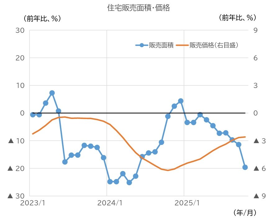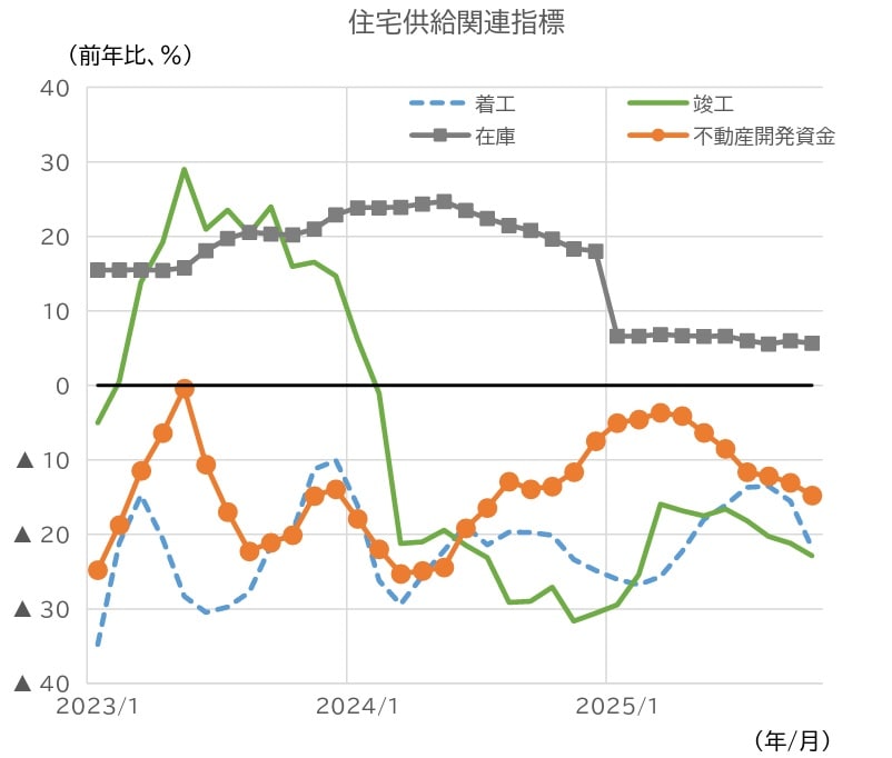 供給側の動向に関して、住宅着工床面積(3カ月後方移動平均)の前年同月比伸び率は、前月からマイナス幅が拡大した(図表14)。住宅竣工床面積(同上)の伸び率も、マイナス幅が拡大した。住宅完成在庫床面積は依然増加しているが、伸び率は9月から10月にかけて小幅に低下した。また、不動産開発資金(同上)の伸び率は、依然として前年同月比でマイナスとなっている。24年春先以降、改善傾向にあったが、25年4月以降、マイナス幅が拡大している。