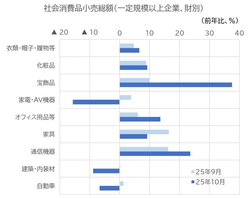 一定規模以上企業を対象にした統計で財の品目別の動向をみると、衣類等や化粧品で伸び率が上昇したほか、宝飾品の伸び率が顕著に高まった(図表10)。耐久消費財の買い替え支援策の対象となっている商品については、家電・AV機器や自動車の伸び率がマイナスに転じた。(タブレットを含む)オフィス用品、通信機器では伸び率が上昇、家具は伸び率が低下した。不動産関連の財(建築・内装材)の伸び率は、プラスからマイナスに転じた。