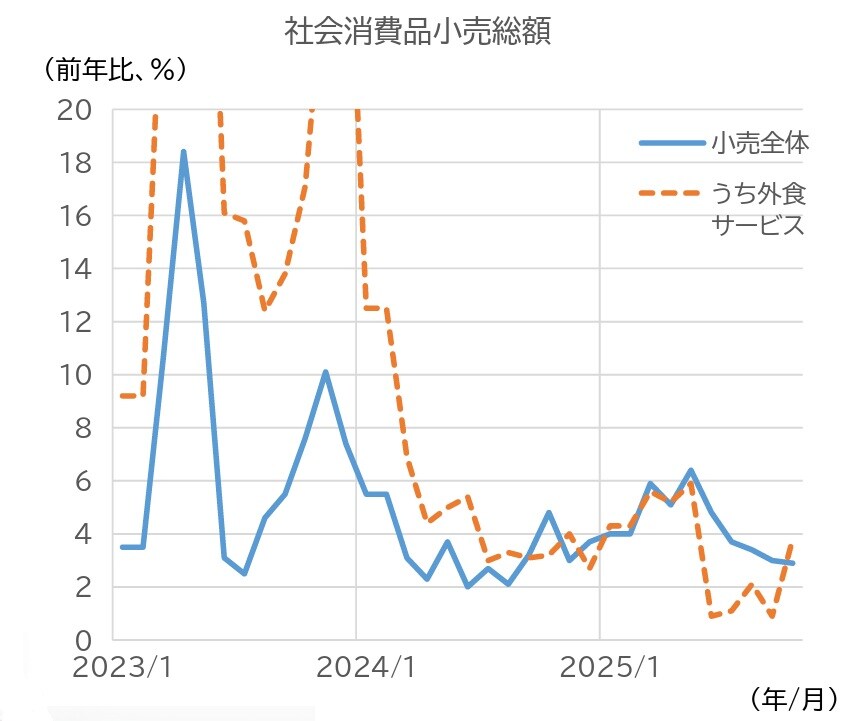消費の動向について、小売売上高の伸び率をみると、10月は前月に続き低下した(図表9)。財が引き続き鈍化した一方、外食サービスは改善した。