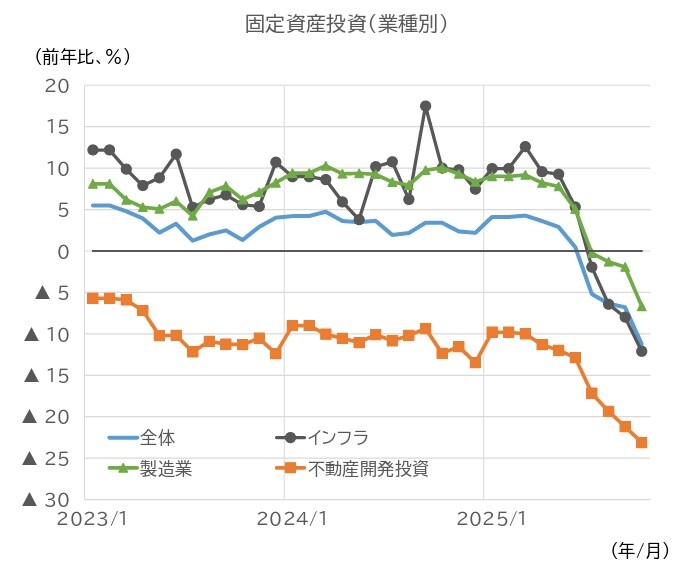 不動産市場について、10月の住宅販売床面積の前年同月比伸び率は、マイナス幅が前月から拡大した(図表13)。住宅販売価格(70都市単純平均)の前年同月比は、22年4月以降、43カ月連続でマイナスとなっている。24年10月を底にマイナス幅の縮小が続いているが、頭打ち感がみられる。