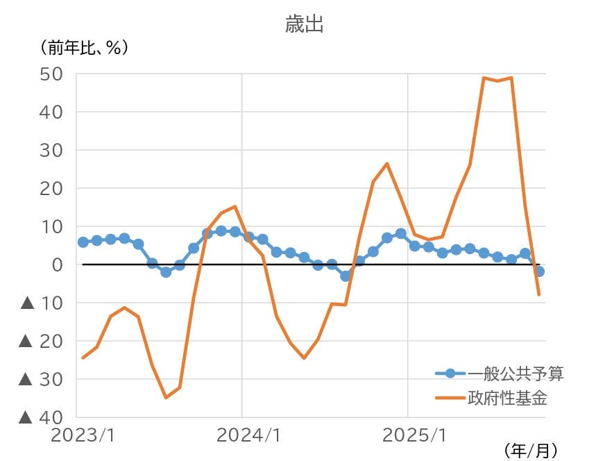 財政の動向をみると、歳出(3カ月後方移動平均)については、一般公共予算の伸び率が10月にマイナスに転じた(図表15)。政府性基金も、10月にマイナスに転じた。歳入(同上)については、一般公共予算の伸び率が低水準にとどまっているものの、6月以降、緩やかに上昇している。政府性基金は、10 月にマイナスに転じた(図表16)。一般公共予算のうち、税収の伸び率は上昇している一方、非税収入の伸び率は6月以降マイナス圏で推移している。