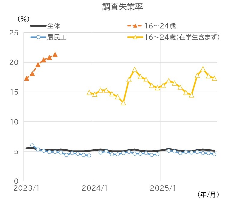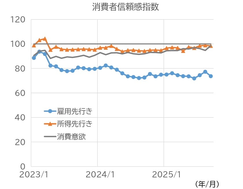 家計の状況について、10月の都市部の調査失業率は、前月に続き小幅に低下した(図表11)。16~24歳(在学中の学生を除く)の失業率は、10月まで依然として前年を上回る水準で推移しており、若年層の雇用環境は依然厳しい状況にある。消費者信頼感指数をみると、依然として楽観・悲観の境目の水準である100を下回る水準で推移している(図表12)。9月には、消費意欲が改善した一方、雇用・所得の先行きは悪化した。
