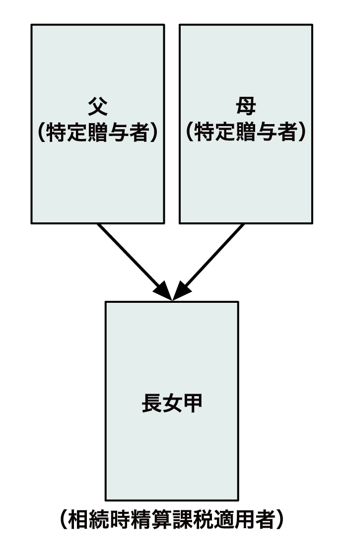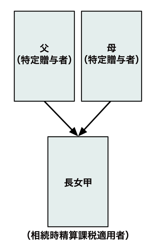 たとえば、長女甲が父と母の双方から財産の贈与を受け、それぞれについて相続時精算課税制度を選択していたとします。