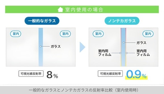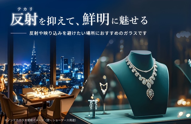 ノンテカガラスは、高透過ガラスと低反射フィルムを組み合わせることで、見え方と導入しやすさのバランスを重視した低反射ガラスです。