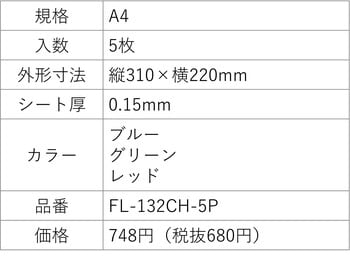 カラーはブルー、グリーン、レッドの3色で、メーカー希望小売価格(税込)は、5枚入りで748円です。
