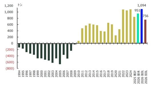 注:2025年の推定値は、同年第3四半期の純購入量634トン(報告ベース)と、2011-24年の年間需要に占める第4四半期の平均比率(25%)から導出した第4四半期の推定需要量に基づいています。2026年の予測値は、2011-25年の公的部門需要の前年比伸び率を適用して導出しており、基本シナリオではその平均値、強気シナリオでは80パーセンタイル値、弱気シナリオでは20パーセンタイル値を使用しています。過去のパフォーマンスは将来のパフォーマンスの信頼できる指標ではありません。