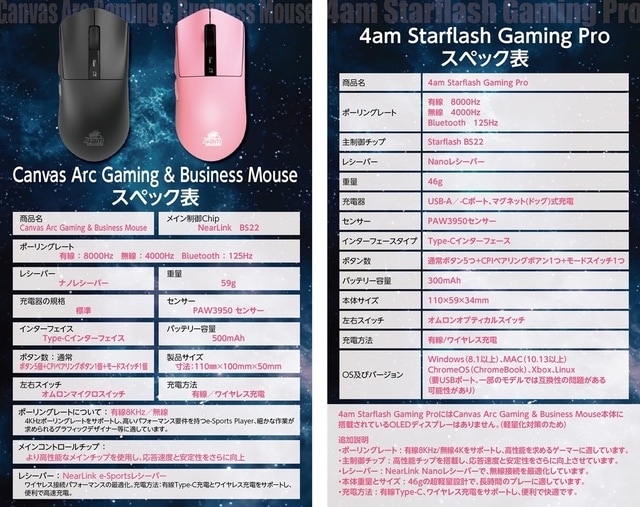 株式会社ラッシュライフ(本社:大阪府大阪市、代表取締役:庄司桂康氏)は、ゲーミング由来技術で開発された超低遅延プロ仕様マウス「Canvas Arc Gaming & Business Mouse (汎用タイプ)」と「4am Starflash Gaming Pro (ゲーム特化タイプ)」の2モデルを、2025年12月22日(月)より、アタラシイものや体験の応援購入サービス「Makuake」にて発売する。以下、PR TIMESより。