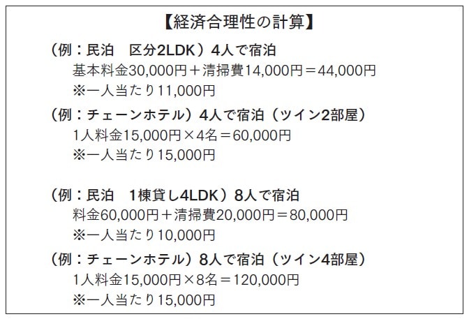 大手との差別化要素を持ちながら、さらにリーズナブルに宿泊できる、その経済合理的な説明が、上の数式です。大手のビジネスホテルでは寝るだけの空間になりがちですが、民泊や旅館には、家族や仲間と団らんできるリビングスペースがあることも多く、滞在中に旅の思い出を気兼ねなく団らんできることが、特別な体験になります。