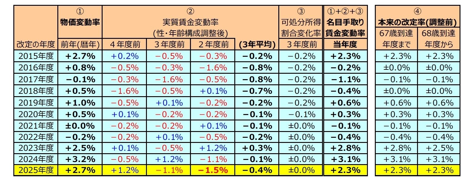 2025年度の改定率には2021~2023年度の実質賃金変動率の平均が使用され、4年度前にあたる2021年度が前年度にコロナ禍の影響で低下した反動(増加率の分母が下がった影響)や行動制限の影響が少なかった業種で賃上げが堅調だった影響で+1.2%となったものの、3~2年度前にあたる2022~2023年度は大幅な物価の伸びに賃金の伸びが追いつかず-1.1%と-1.5%になった。これらを掛け合わせた3年度平均では、3~2年度前のマイナスが4年度前のプラスで緩和されて、-0.4%のマイナスにとどまった。