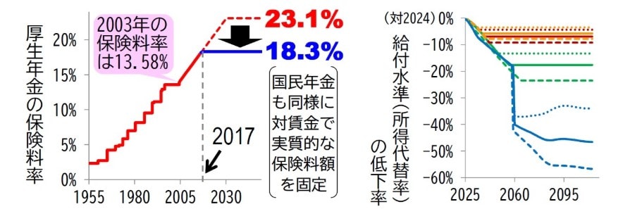 2004年の改正では、年金財政の基本的な仕組みが大きく変わった。2004年改正より前は、大まかに言えば、少子化や長寿化の進展にあわせて将来の保険料を引き上げ、給付水準を維持する仕組みだった。しかし、2002年に公表された試算では、当時の給付水準を維持するには厚生年金の将来の保険料を当時の2倍近い水準(労使合計で年間給与の23.1%)へ引き上げる必要がある、という結果になった(図表2左)。