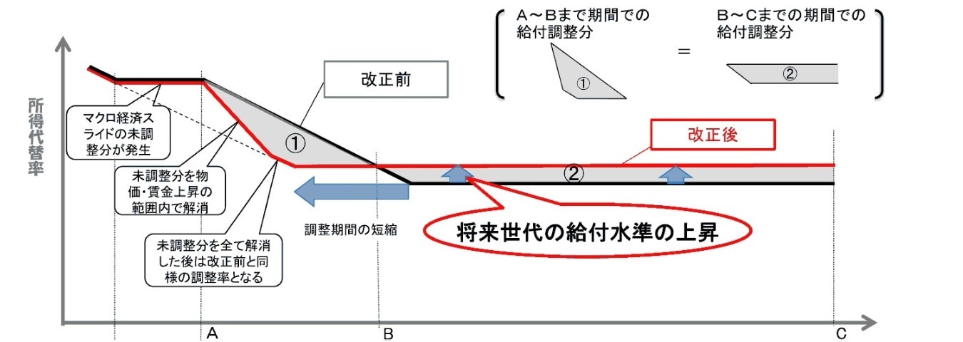 改正後は、未調整分が繰り越されて調整されれば、特例ルールに該当した年度については未調整分の先送りが生じて給付費の実質的な減額ができないものの(図表8左の点線と赤線で囲まれた部分)、それ以降に調整率が本来の水準に戻っていき、改正前の制度よりも給付費の実質的な削減が進む可能性が出てくる(図表8左の①の部分)。その結果、改正前の制度よりも調整期間の短縮が図られ、将来の給付水準の低下が抑えられることになる(図表8の丸い吹き出し)。