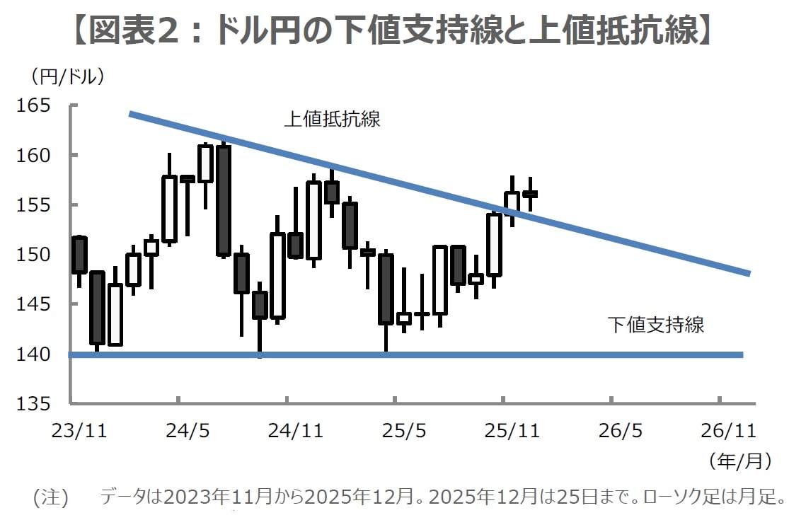 ドル円はこの先、155円を中心とするレンジ推移から、徐々に150円を中心とするレンジ推移へ移行すると想定しており、年末着地水準を150円に設定しています。ドル円の値動きについては、11月26日付レポートで示した「ディセンディング・トライアングル(下降型の三角保ち合い)」が1つの参考になると思われ(図表2)、弊社の見通しに基づけば、ドル円はおおむね上値抵抗線に沿った動きが予想されます。