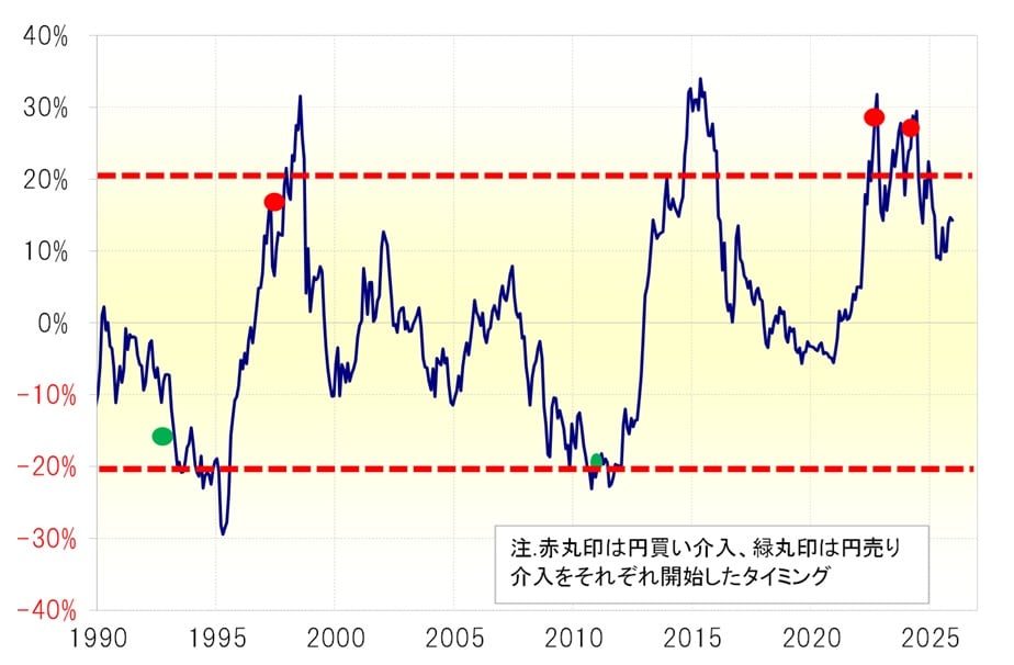 このように、5年MAとのかい離という観点で見る限り、過去に介入が行われた水準にはまだ達していません。したがって、「断固たる」といった強い表現はあったものの、現時点で当局が介入再開を決めた可能性は低いと考えられます。