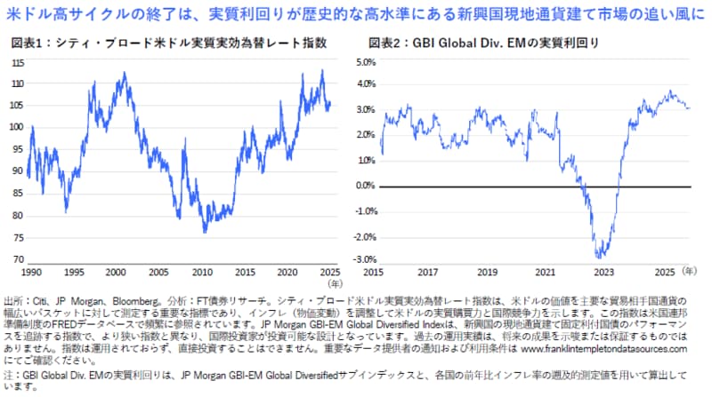 これは新興国市場にとっては朗報です。米ドルが安定すれば、新興国通貨のドローダウンリスクを抑制し、必要に応じて新興国の中央銀行が成長を支援するための政策余地を確保できます。多くの新興国の中央銀行はすでに利下げサイクルの終盤にありますが、新興国債券の実質利回り(インフレ調整後)は歴史的な高水準を維持しており(図表2参照)、これがインフレ期待の安定化、新興国現地通貨建て市場への資金流入の維持・拡大、そしてリスク環境における予期せぬ混乱への一定のバッファになると見込んでいます。