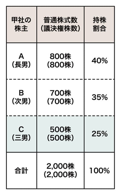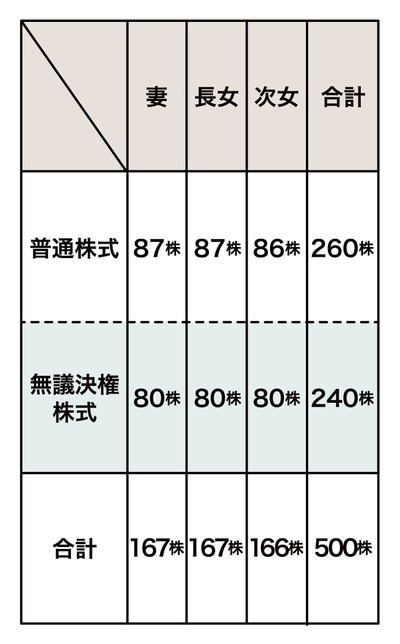 Cさんは、妻・長女・次女に贈与することを前提に、まず保有する普通株式500株のうち240株を無議決権株式へ変更し、その無議決権株式(240株)を3人へ一括贈与しました。