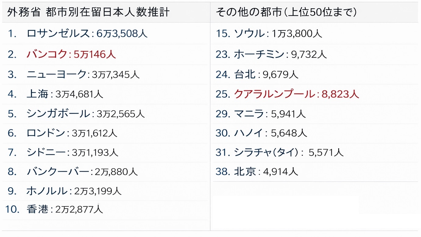 外務省の資料によると、バンコク居住の日本人は5万人以上、クアラルンプール居住の日本人は9,000人弱です。