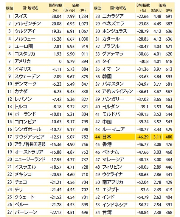 「ビッグマック」で比較する世界のお金の価値
