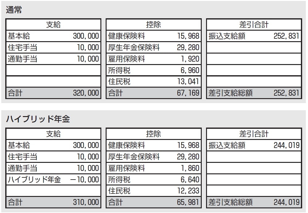 単純には計算できませんが、月額給与が320,000円(総支給)で30歳の、通常の場合とハイブリッド年金を選択したときの給与明細は次のようになります。