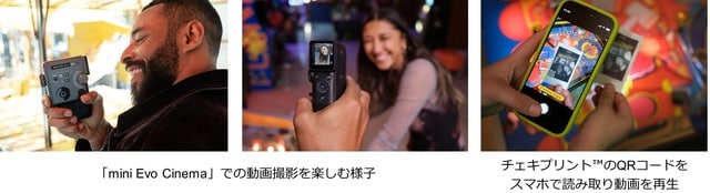 今回発売する「mini Evo Cinema」は静止画に加えて、動画の撮影が可能。撮影した動画データをQRコード※1化し、動画の中から切り出した静止画と一緒にチェキプリント™にして”動画を手渡せる”インスタントカメラです。動画をチェキプリント™にすることで、大切な人と過ごした様々なシーンをカタチにして残せるだけでなく、QRコードから動画をいつでも手軽に見返すことができます。