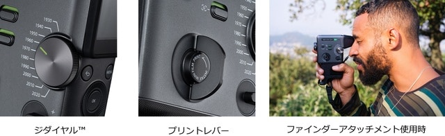 カメラ本体は、黒とグレーを基調にしたクラシックで高級感のあるデザインで、当社が1965年に発売し、誰でも簡単に日常を動画に残せる画期的なホームムービーシステムとして人気を博した8mmカメラ”フジカ シングル-8”を彷彿とさせる縦持ちスタイルを採用しました。指先に伝わるクリック感が魅力の「ジダイヤル™」や、フィルムを手で巻き上げるような感覚で操作できる「プリントレバー」など、細部にまでこだわったデザインとアナログな操作感で撮影とプリントの楽しみを広げます。