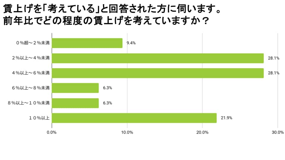 経営者が検討する賃上げ幅も増加している。賃上げを検討している人に対して「前年比でどの程度の賃上げを考えているか」と聞いたところ、「4%以上」との回答が62.5%に達した。前回調査の55.3%を上回り、経営者がCPIの上昇率を超える賃上げを検討している。