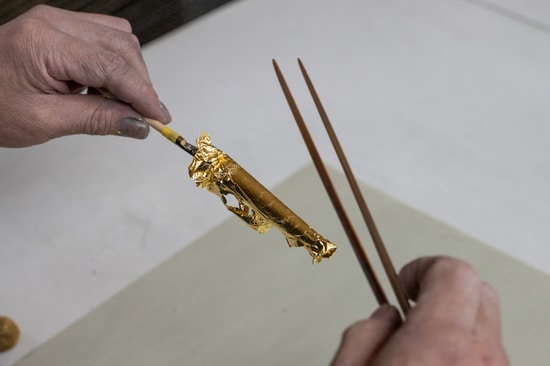 ●金箔を微細な粒状にし、職人が一点ずつ散らして定着させる極めて繊細な手仕事