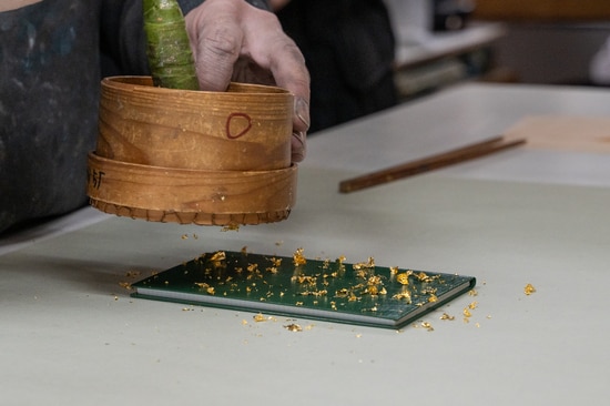 ●京都の職人が一点ずつ箔を圧着する、伝統的な箔押しの手仕事