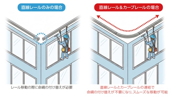 従来は直線レールをコーナーに対して施工するのみの対応で、高所作業員はコーナーの切り返しの度に命綱を付け替える必要がありました。