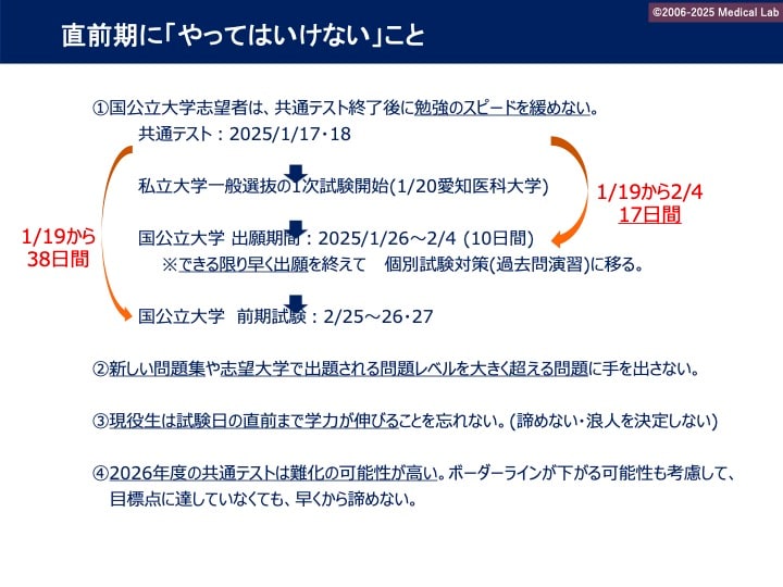 私立医学部の出願がほぼ終わり、国公立大学志望者は共通テストを終えて自己採点を済ませる。1月下旬は、前期・後期をどうするかを考えながら、本番までの残り時間をどう使うか決めなければならない時期だ。