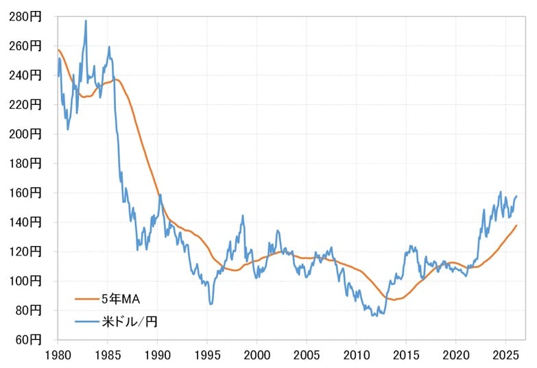 このように2年以上にわたり150円前後の米ドル高・円安圏で推移するなか、2024年7月に125円程度だった5年MAは、足下では138円前後まで大きく上昇しています(図表4参照)。その結果、5年MAを3割上回る水準は、2024年7月時点の160円前後から、現在では180円近くにまで引き上がっています。