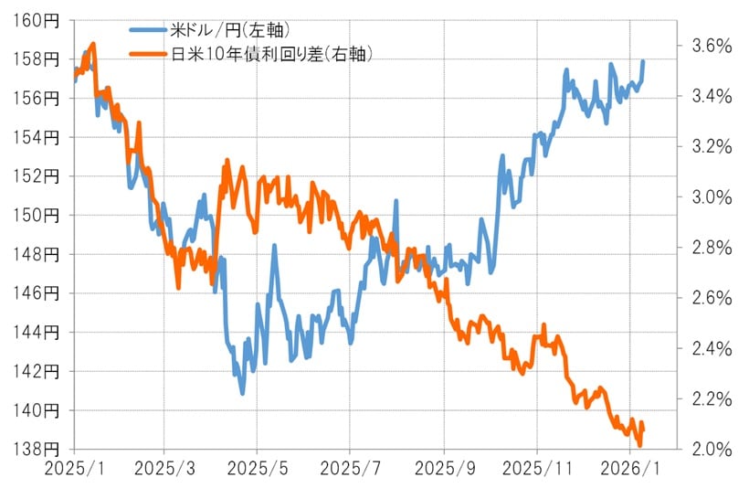こうした米ドル/円を取り巻く環境の変化には、金利差との関係があるとみられます。日米金利差(米ドル優位・円劣位)は2025年を通じて大きく縮小しており、仮に2025年1~3月の金利差と米ドル/円の関係を前提にすれば、現在の米ドル/円は140円を割れていても不思議ではありません。しかし実際には160円に向かう動きとなっています(図表5参照)。
